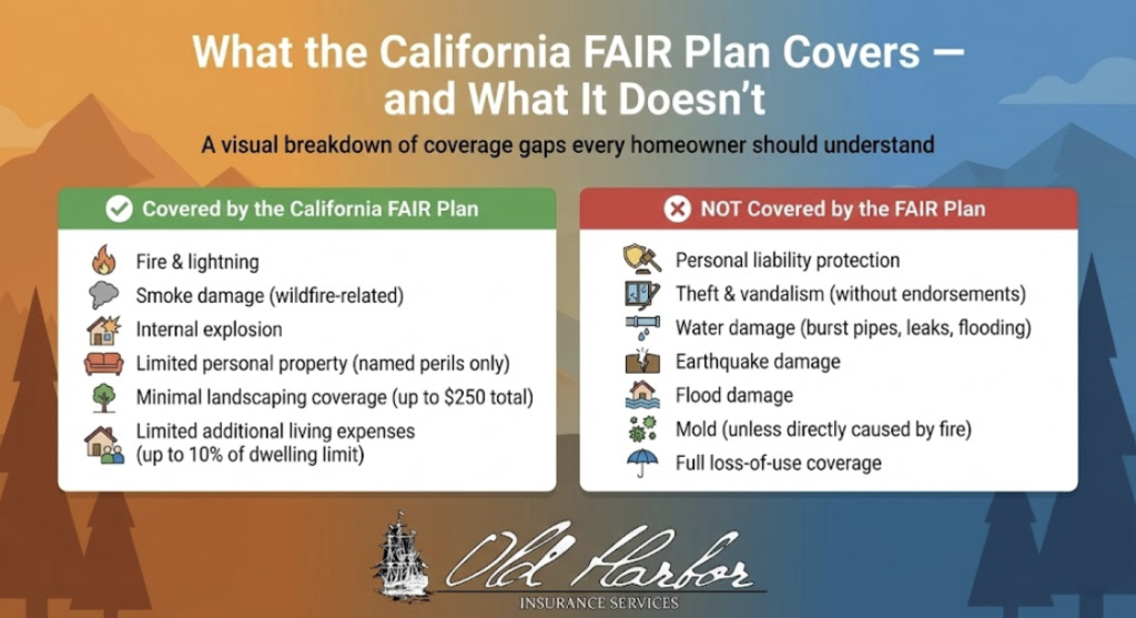 The insurance denial letter arrives with clinical efficiency—your application declined, your options narrowing to a single state-mandated alternative. For California homeowners pushed into the FAIR Plan by wildfire risk, understanding exactly what this coverage includes—and more critically, what it excludes—becomes the difference between adequate protection and catastrophic financial exposure.