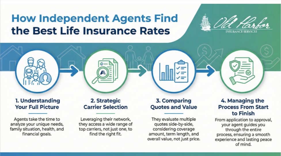 You may have noticed how life insurance quotes vary widely for similar coverage—one person might pay $40 a month while another pays $60. That difference comes from carrier pricing, not coincidence. At Old Harbor Insurance, we work with multiple A-rated carriers, giving Orange County families access to options and rates that captive agents often can’t offer.