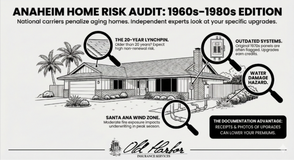 Insurance carriers don’t treat a 1970s Anaheim home the same as new construction—older homes do present different risks. However, they often apply blanket penalties without examining your specific home’s condition. If your roof was replaced in 2019, electrical system upgraded in 2015, and plumbing updated in 2018, your home is far less risky than similar-age homes with original systems—yet many insurers charge the same premium.