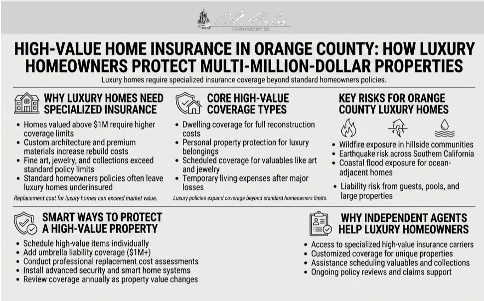 Orange County luxury properties exceeding $1 million demand specialized insurance that standard policies simply don’t provide. Custom architectural features, fine art collections, and high-end amenities require tailored coverage most homeowners overlook. Generic policies leave these properties severely underinsured. That’s why partnering with a local independent agent like Old Harbor Insurance is essential.