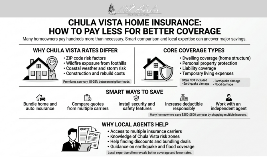 Most Chula Vista homeowners don’t realize they’re paying hundreds more than necessary for home insurance. Between aggressive rate increases from national carriers, difficulty finding coverage in high-risk ZIP codes, and confusion about what policies actually cover, getting fair pricing feels impossible. That’s where working with an independent agent like Old Harbor Insurance makes all the difference.