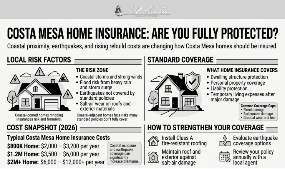 Costa Mesa homeowners face unique insurance challenges shaped by coastal proximity and California’s tightening market. Many residents discover their coverage leaves critical gaps unprotected. Old Harbor Insurance works with Costa Mesa residents to find protection that fits their coastal-adjacent risks.